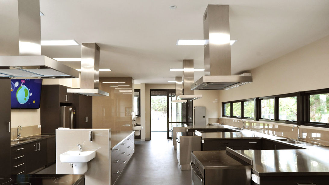 The project consists of a new building designed for State of the Art teaching kitchen for approximately 22 primary school children; including purpose designed stainless steel teaching benches and storage, stoves/cook tops, range hoods, interactive TV, part indoor / outdoor seating area for both school and local community activity use.